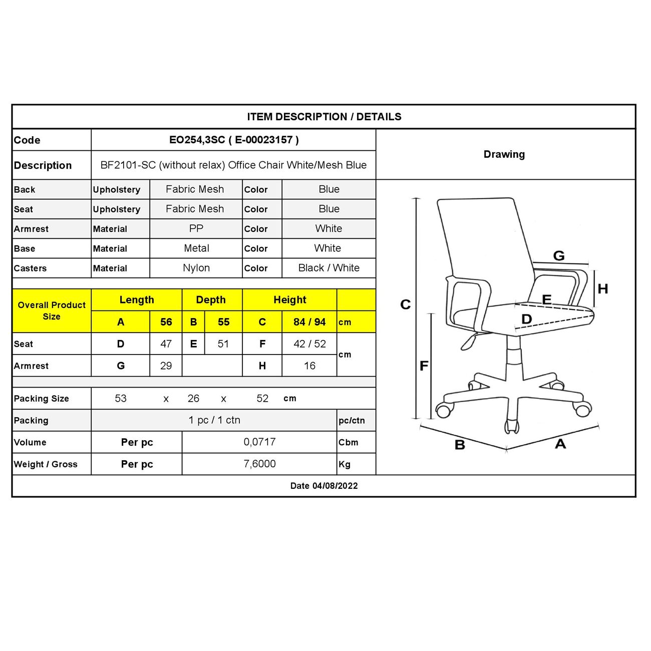 ΕΟ254,3SC BF2101-SC (χωρίς ανάκλιση) Πολυθρόνα Άσπρο/Μπλε Mesh