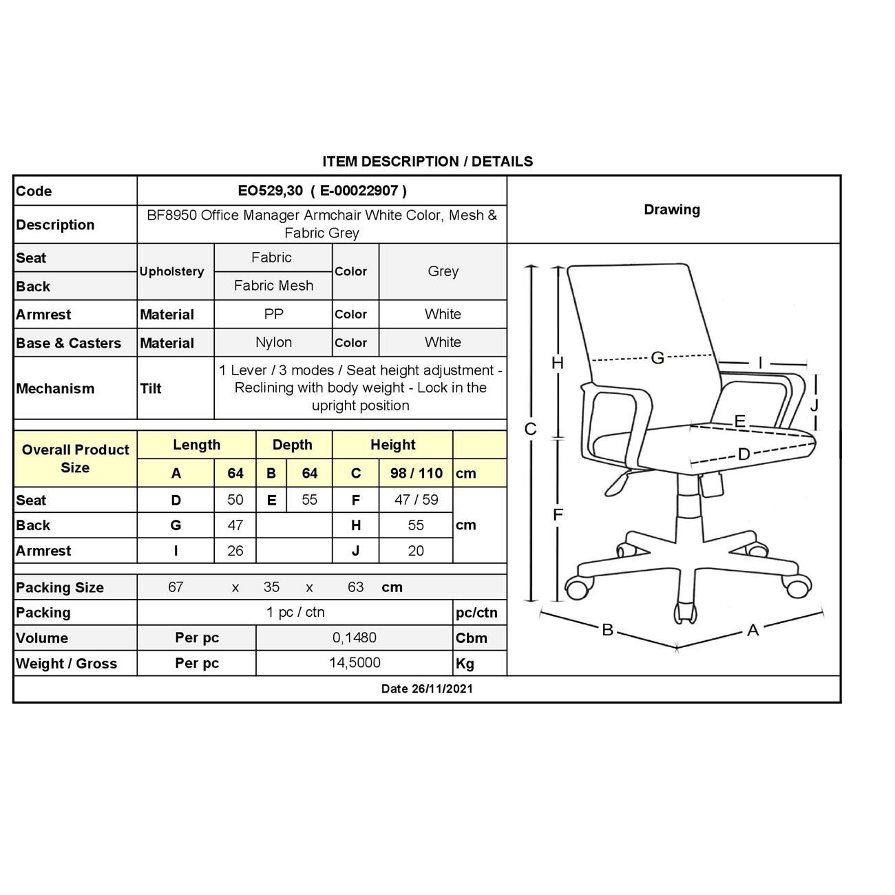 ΕΟ529,30 BF8950 Πολυθρόνα Άσπρο / Mesh-Ύφασμα Γκρι