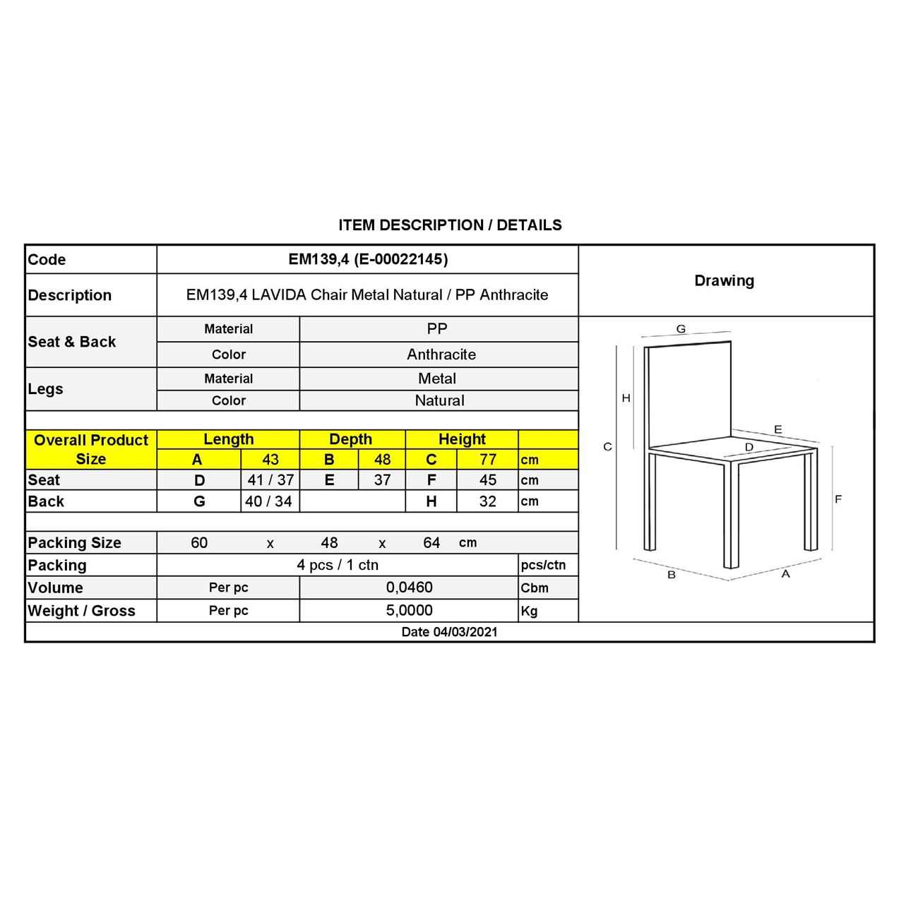 ΕΜ139,4 LAVIDA Καρέκλα Μεταλλική Φυσικό, PP Ανθρακί