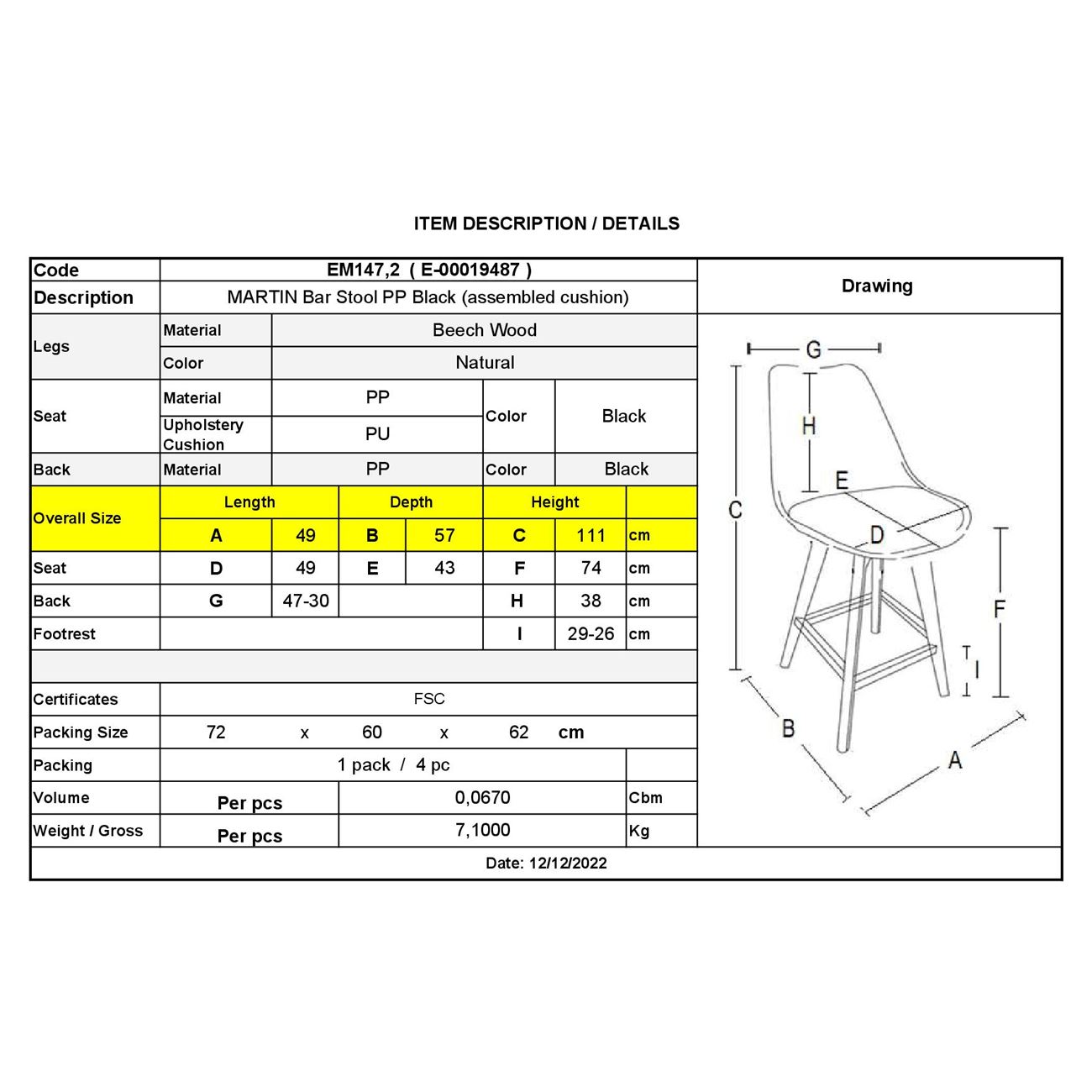 ΕΜ147,2 MARTIN Σκαμπώ Bar PP Μαύρο (Μοντ/νη ταπετσαρία)