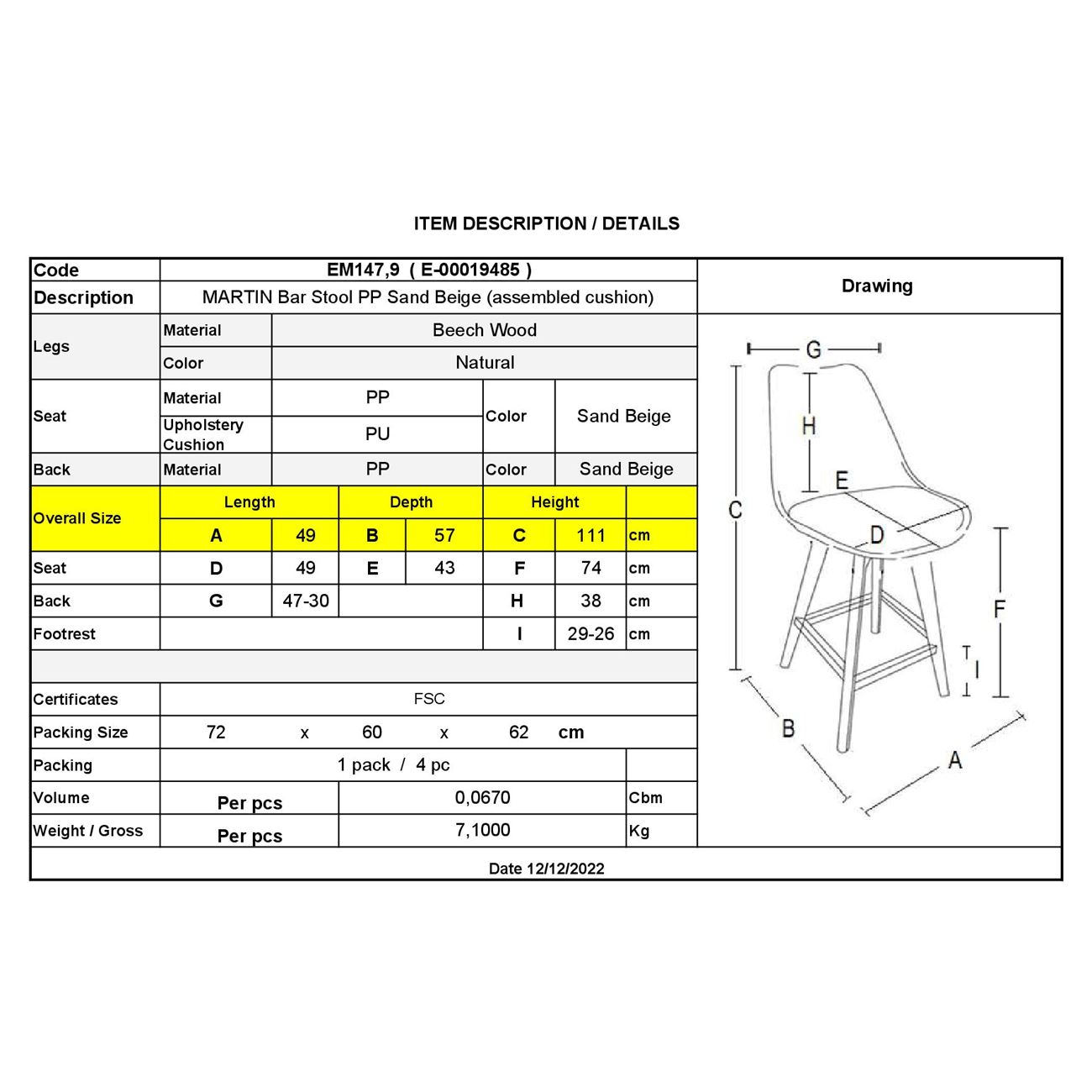 ΕΜ147,9 MARTIN Σκαμπώ Bar PP Sand Beige (Μοντ/νη ταπετσαρία)