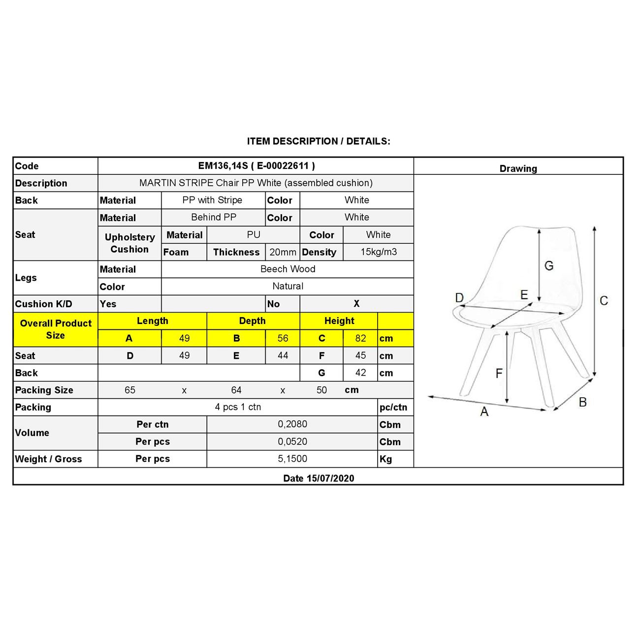 ΕΜ136,14S MARTIN STRIPE Καρέκλα PP Άσπρο (Ξύλινο πόδι-Μοντ/νη ταπετσαρία)