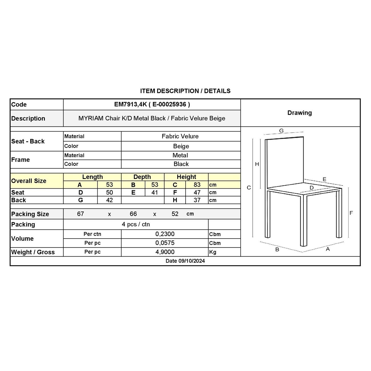 ΕΜ7913,4Κ MYRIAM Καρέκλα K/D Μέταλ.Μαύρο/Ύφασμα Velure Μπεζ (Συσκ.4)