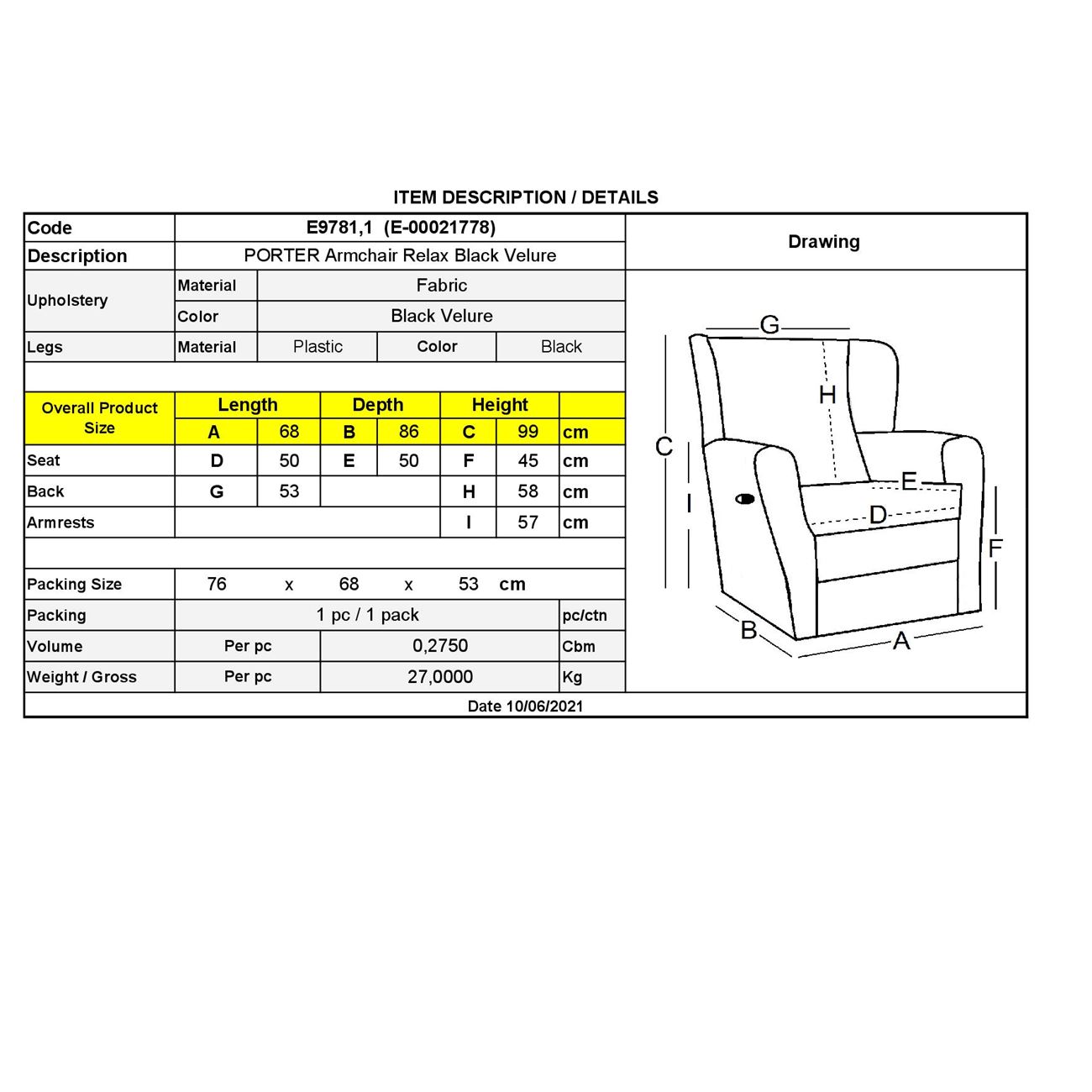 Ε9781,1 PORTER Πολυθρόνα Relax Μαύρο Velure