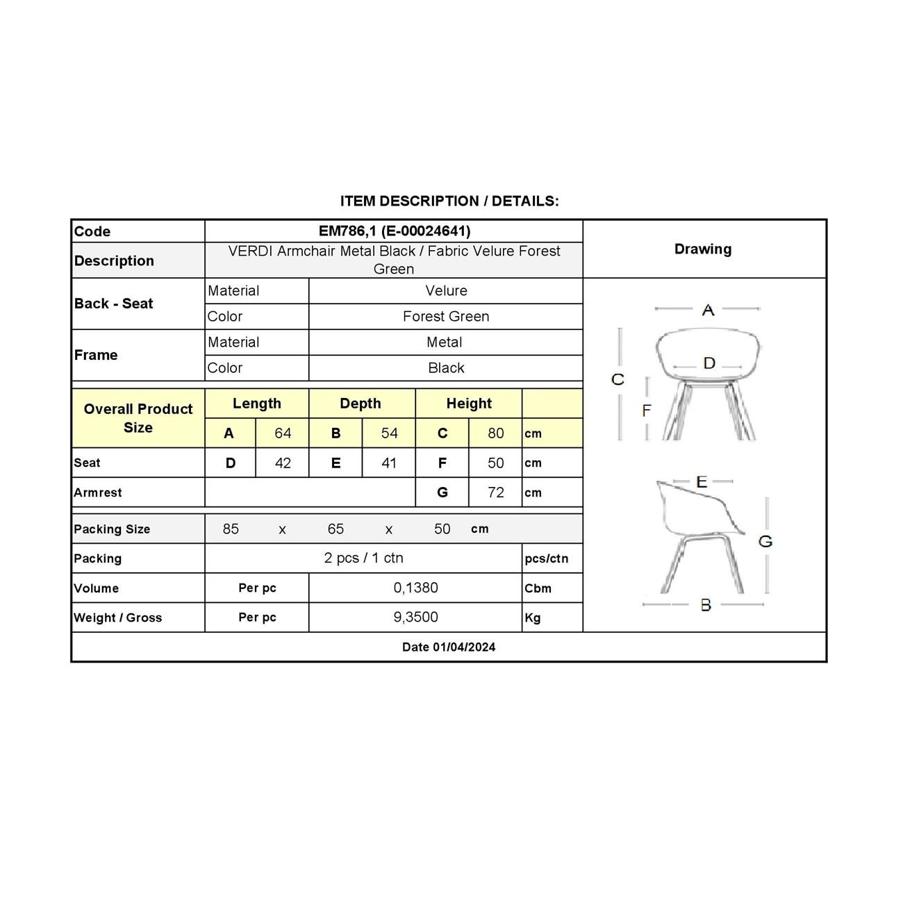 ΕΜ786,1 VERDI Πολυθρόνα Μεταλ.Μαύρο/Ύφασμα Velure Forest Green