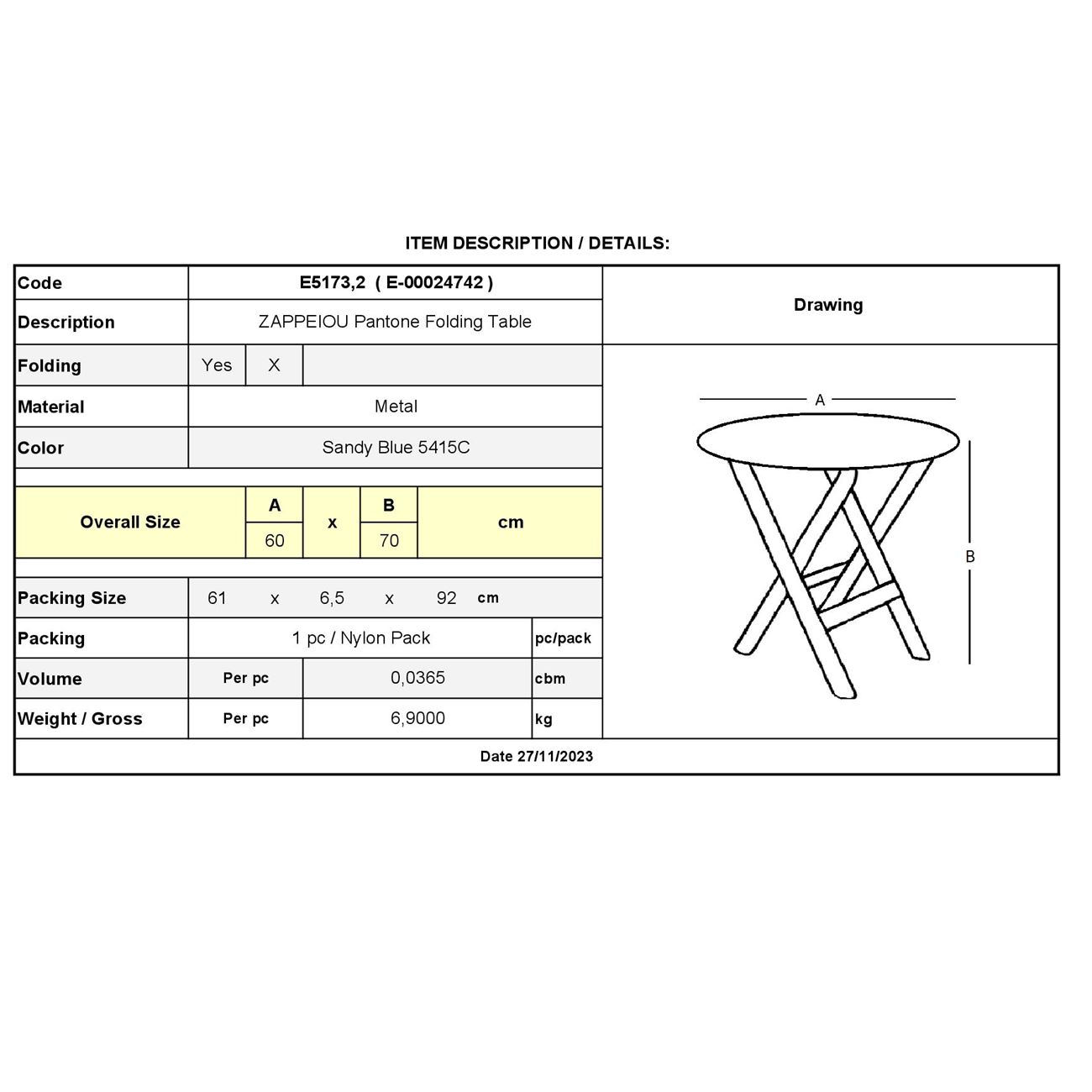 Ε5173,2 ΖΑΠΠΕΙΟΥ Pantone Τραπ.Πτυσ/νο Φ60cm Μεταλ.Sandy Blue 5415C